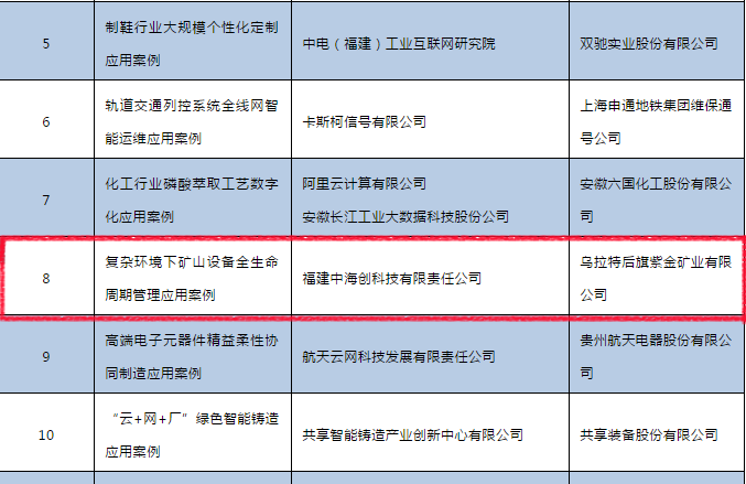 福建中D体育在线登录入口科技《复杂环境下矿山设备全生命周期管理》项目成功入选工信部2019年工业互联网平台创新应用案例。