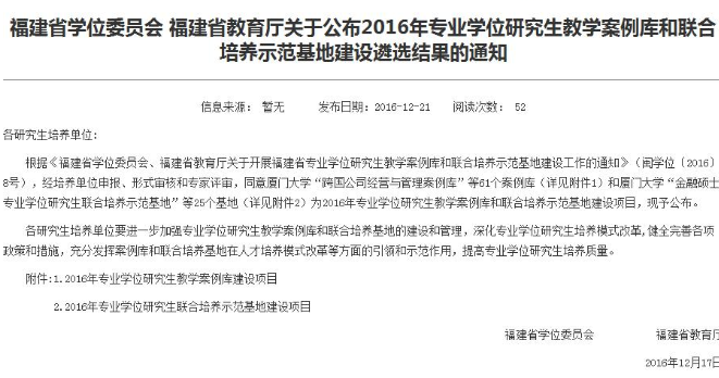 日前,福建省学位委员会和福建省教育厅联合发布了《2016年专业学位研究生教学案例库和联合培养示范基地建设遴选结果的通知》